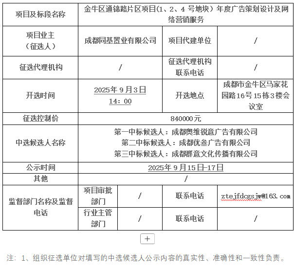 金牛区通锦路片区项目(4号地块) 营销示2025-09-09 成都同基置业有限公司作为征选人,对金牛区通锦路片区项... |